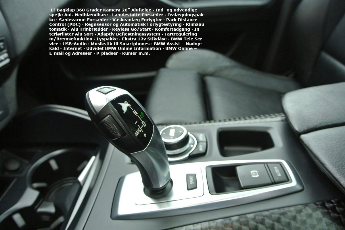Alpin Hvid m/Sort Nevada Læder Interiør · Glas El-Soltag · BMW Sportspakke · Navigation Professionel · Bi-Xenon m/Kurvelys · 8Trins Automatgear · Fartpilot · Niveauregulering m/Luftaffjedring · Aftageligt Anhængertræk · El-Sportssæder m/Memory på Førersædet · El-Bagklap 360 Grader Kamera 20” Alufælge · Ind- og udvendige spejle Aut. Nedblændbare · Lændestøtte Forsæder · Fralægningspakke · Sædevarme Forsæder · Vaskeanlæg Forlygter · Park Distance Control (PDC) · Regnsensor og Automatisk Forlygtestyring · Klimaautomatik · Alu Trinbrædder · Keyless Go/Start · Komfortadgang · Interiørlister Alu Sort · Adaptiv Befæstningssystem · Fartregulering m/Bremsefunktion · Lyspakke · Ekstra 12v Stikdåse · BMW Tele Service · USB-Audio · Musikstik til Smartphones · BMW Assist – Nødopkald · Internet · Udvidet BMW Online Information · BMW Online – E-mail og Adresser · P-pladser · Kurser · RSS-Feeds · Vejr og Hoteller · Forberedt Handsfree Business m/Bluetooth Stik · DAB-Tuner · Hi-Fi System Professionel · Læderrat m/Padler · BMW Individual Højglans Shadow Line · BMW Individual Loftshimmel Antrazit · Dagslys indstilbar over Lysmeny · Dieselpartikelfilter · Euro5 Norm m.m.