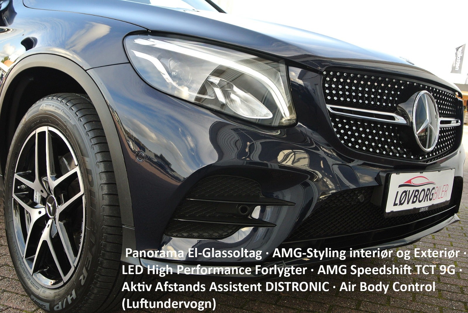 Cavansitblau Metallic · Læder ARTICO sæder/døre/instrumentpanel · AMG-Styling interiør og Exteriør · Panorama El-Glassoltag · AMG-Styling interiør og Exteriør · Garmin Map Pilot · LED High Performance Forlygter · AMG Speedshift TCT 9G · Aktiv Afstands Assistent DISTRONIC · Air Body Control (Luftundervogn) · Burmeister Surround System · Varme- og lyddæmpende Akustikglas · Klimaautomatik THERMATIC · Dødvinkels Assistent · Adaptiv Fjernlys Assistent · EASY PACK laderumsafdækning · Tonede Ruder · Hands Free Adgang · Varme i forsæder · EASY PACK Hækklap · i-Size-Kinder (ISOFIX) · Brændstoftank 66 l · Spejl Pakke · Sidde Komfort Pakke · Inde og udespejle Automatisk Nedblænding · Trlrfon Antenne · BakKamera · Aktiv Parkerings Assistent m/PARKTRONIC · Touchpad m/Controller · Digital Radio · CD Afspiller · Diamantgrill · KEYLESS GO · KEYLESS GO Start-Funktion · Udvendig Chrome Pakke · ECO Start-Stop-Funktion · KEYLESS GO Komfort Pakke · Nat Pakke · GPS Antenne · Regnsensor · Mercedes Nødkalds System · Dæktrykskontrol · Otto Partikelfilter · Sort Tagrælling · Kabinebelysnings Pakke · EURO 6 Teknik · Adaptiv Bremselys · Udespejle Elektronisk Klapbare · Fodgænger Beskyttelse m.m.