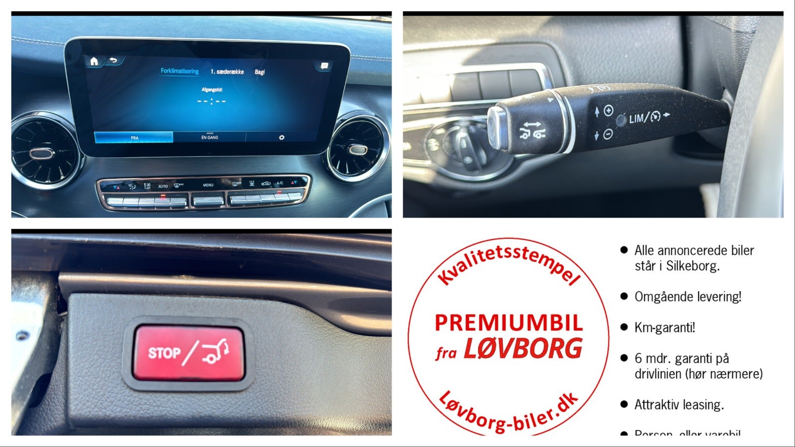Selenitgrå Metallic m/Sort læder Lugano EQV · Avantgarde Line · Sports Pakke Exteriør · Varme/Køl I Forsæder · El-Sæder med memory · Adaptiv Fartpilot Distronic · Kabinevarmer · LED Intelligent Lys System m/Dynamisk Kurvelys · Parkeringshjælp m/360’ Kamera · Burmester Surround Soundsystem · Navigation Plus · El-Skydedøre · Klima Aut. · Sort Lofthimmel · El-Bagklap 2 Delt · Ambiente Belysning · Agility Control-Undervogn m/Selektiv Dæmperfunktion · Elektrisk Bagklap · Telefonforberedelse m/Bluetooth · MB Connect Me · El-Klapbare Sidespejle · Fjernlysassistent · Bordcomputer · Elektrisk Parkeringsbremse · Udstigningslys · Comming-/Leaving Home Lys · Klimaanlæg Bagi · Isofix · Komfortsæder Foran · Elektriske Sidedøre · Førerassistent-Pakke · Blindvinkel Assistent · Parkassistent Parktronic · Lyssensor · Multifunktions Læderrat · Ambiente Belysning · Vognbane-Assistent · ESP · ABS · Pre-Safe · Remote Online · Lændestøtte · Nødopkaldssystem · Træthedsadvarsel · Dæktrykskontrol · Trafikskilte Genkendelse · Tuner/Radio · Sports-Pakke · Stemmekontrol · USB · Tagræling · Aut. Nedblænding af Spejle · LED Baglygter · Mørktonede Ruder i Bag · Højeste Miljøkrav i EU Euro 6 · m.m.