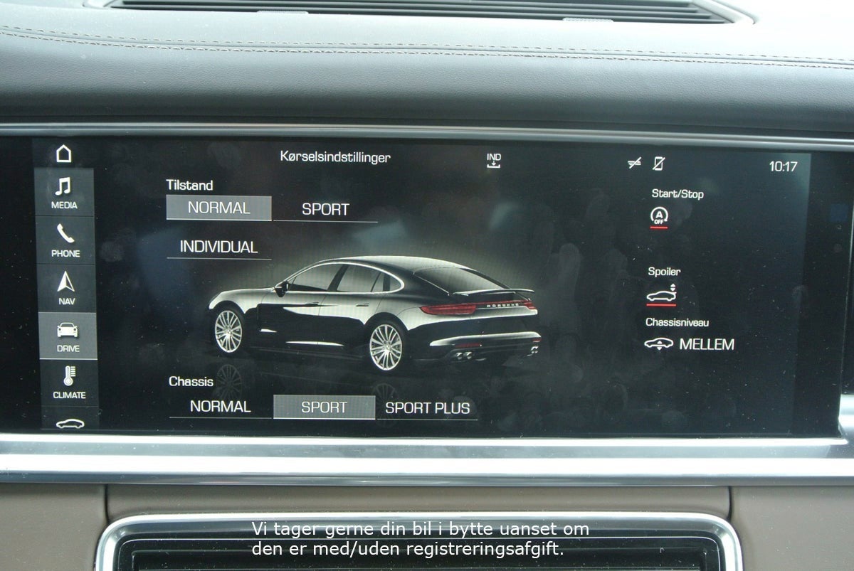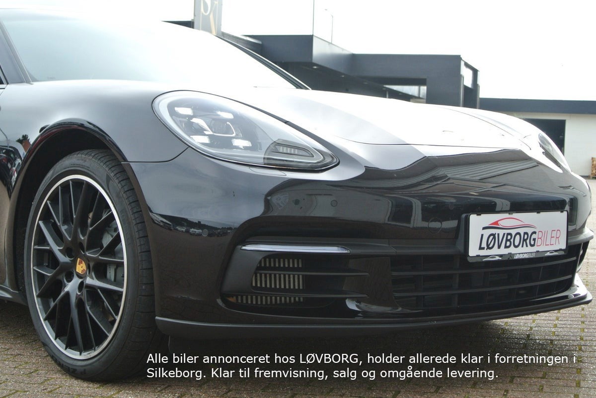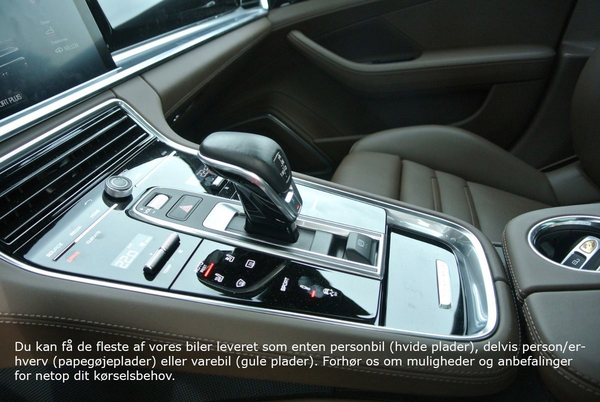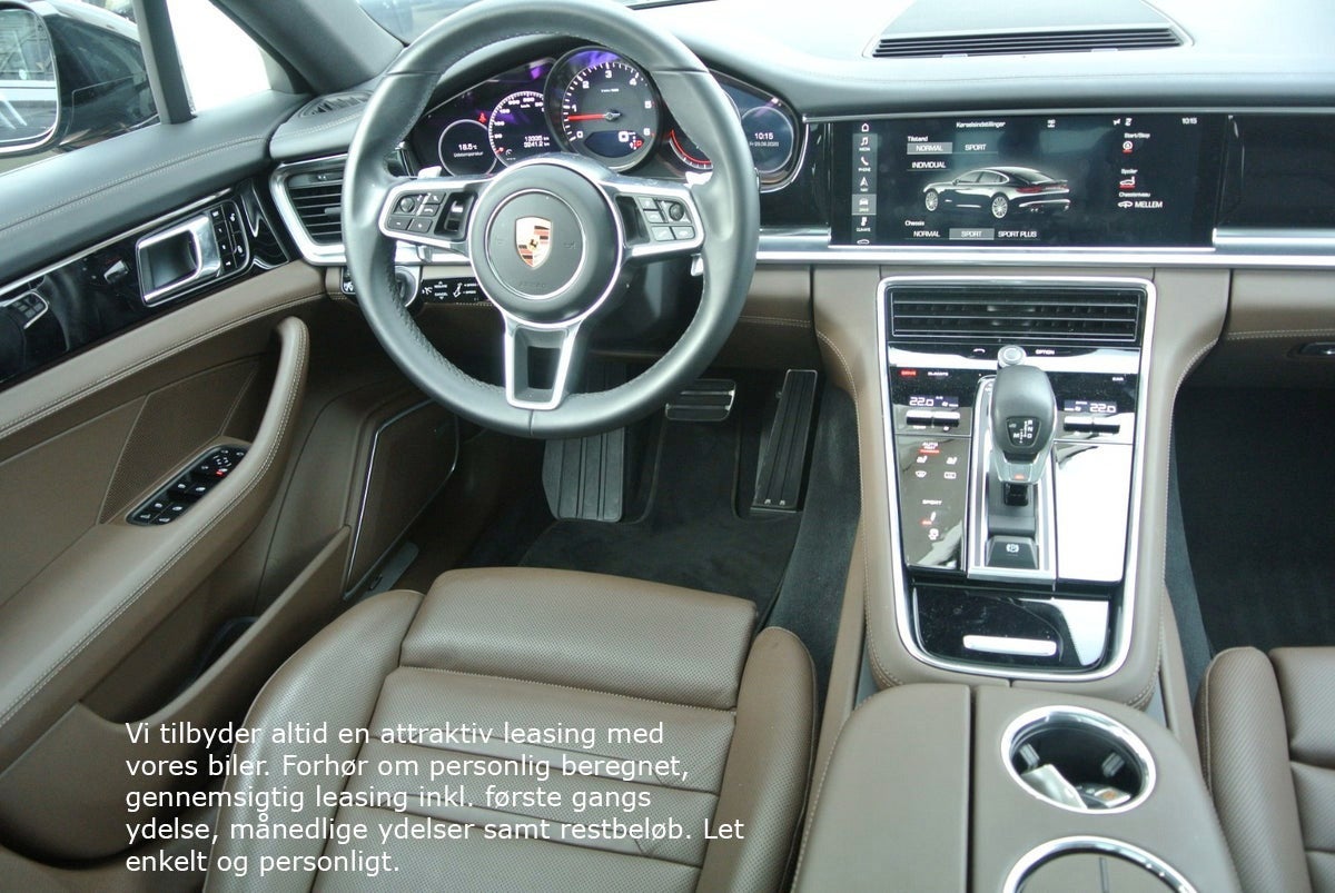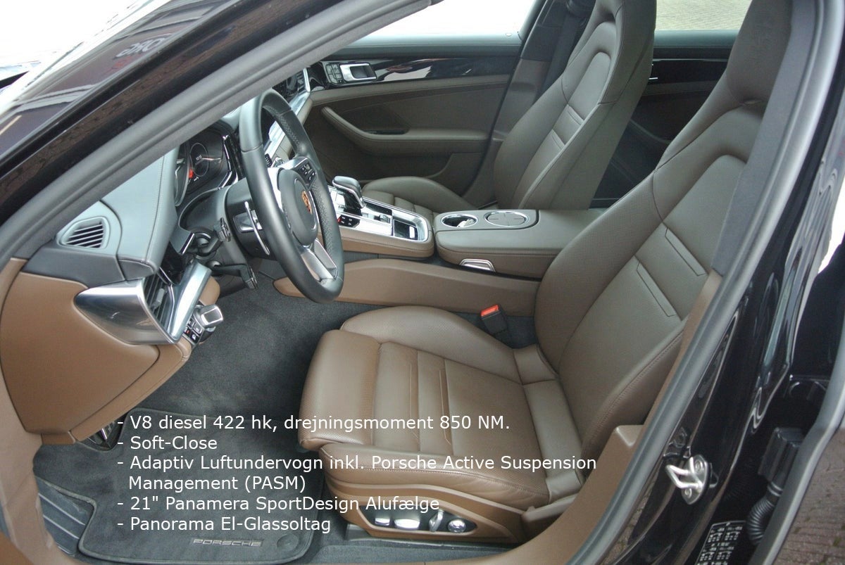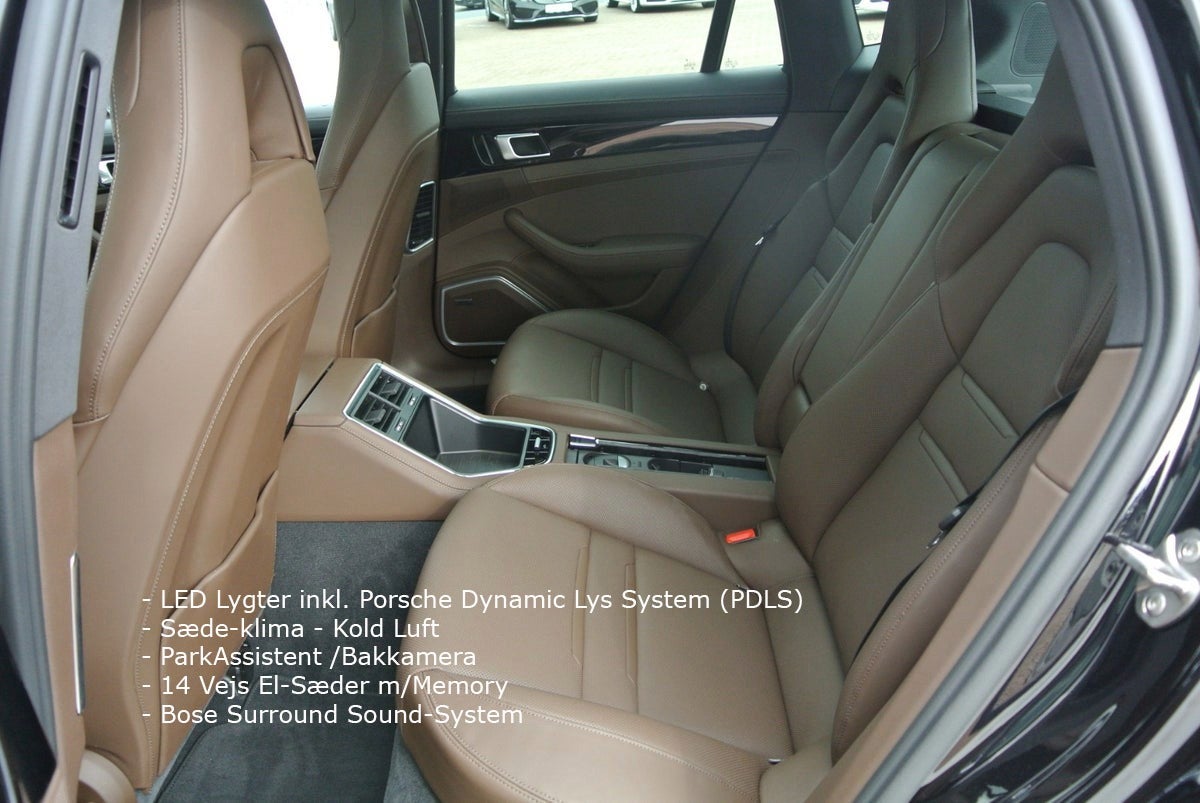 Tiefschwarz Metallic m/Brun Glatlæder · Interiør Lister I Sort Højglans · Porsche Logo I Nakkestøtter · ParkAssistent inkl. Bakkamera · Servostyring Plus · Bose Surround Sound-System · Digital Radio · CD-afspiller · Multifunktions Læderrat m/Varme · Mørktonede Ruder i Bag (Privacy) · Vognbane-Assistent · Skiltevisnings Genkendelse · Sædevarme / Kold Luft · Side-Airbags foran · Fralægnings Pakke · 90L Tank · ABS · ESP · 4 Hjulstræk · Bluetooth/Smartphone Integration/Musik Streaming · TV-Tuner · Fartpilot · Adaptiv Luftundervogn inkl. Porsche Active Suspension Management (PASM) · 21" Panamera SportDesign Alufælge · Panorama El-Glassoltag · LED Lygter inkl. Porsche Dynamic Lys System (PDLS) · El-Sæder m/Memory · Elektrisk Bagklap · EURO 6 Teknik · Handsfree Telefoni · Isofix · Lændestøtte · Dæktrykskontrol. Lygte Vask · Touchscreen · Adaptivt Kurvelys · Apple CarPlay · Bjergkørsel-Assistant · Bordcomputer · Start Spærre · Navigation · Gear-Padler · Start/Stop-Automatik · Traction-Control. USB · Alarm · Armlæn · Blændfrit Fjernlys · El-Sidespejle Klapbare og Opvamede · Udstigningslys fra Sidespejle · Bakspejl Autom. Nedblændbar · Aut · Lys Sensor · Partikelfilter · Regnsensor · Nøgleløs Centrallås · Sædevarme · Fartpilot · Digitalt Cockpit · El-Ratsøjle · PDK-Automatgear · Porsche Logo på Nakkestøtter · Elektrisk Parkeringsbremse · Dæktrykskontrol · Partikelfilter · WLAN-Hotspot m.m.